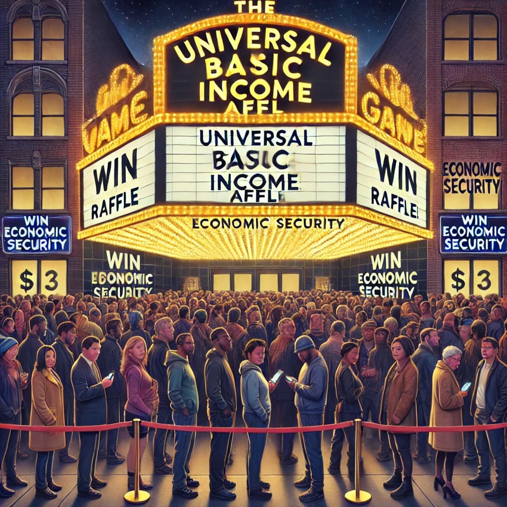 "description": "A diverse crowd lines up outside “The Universal Basic Income Raffle!” venue, clutching oversized tickets as a neon sign flashes “Win Economic Security!” Some are hopeful, others skeptical—waiting for a system that turns survival into a game of chance.",
