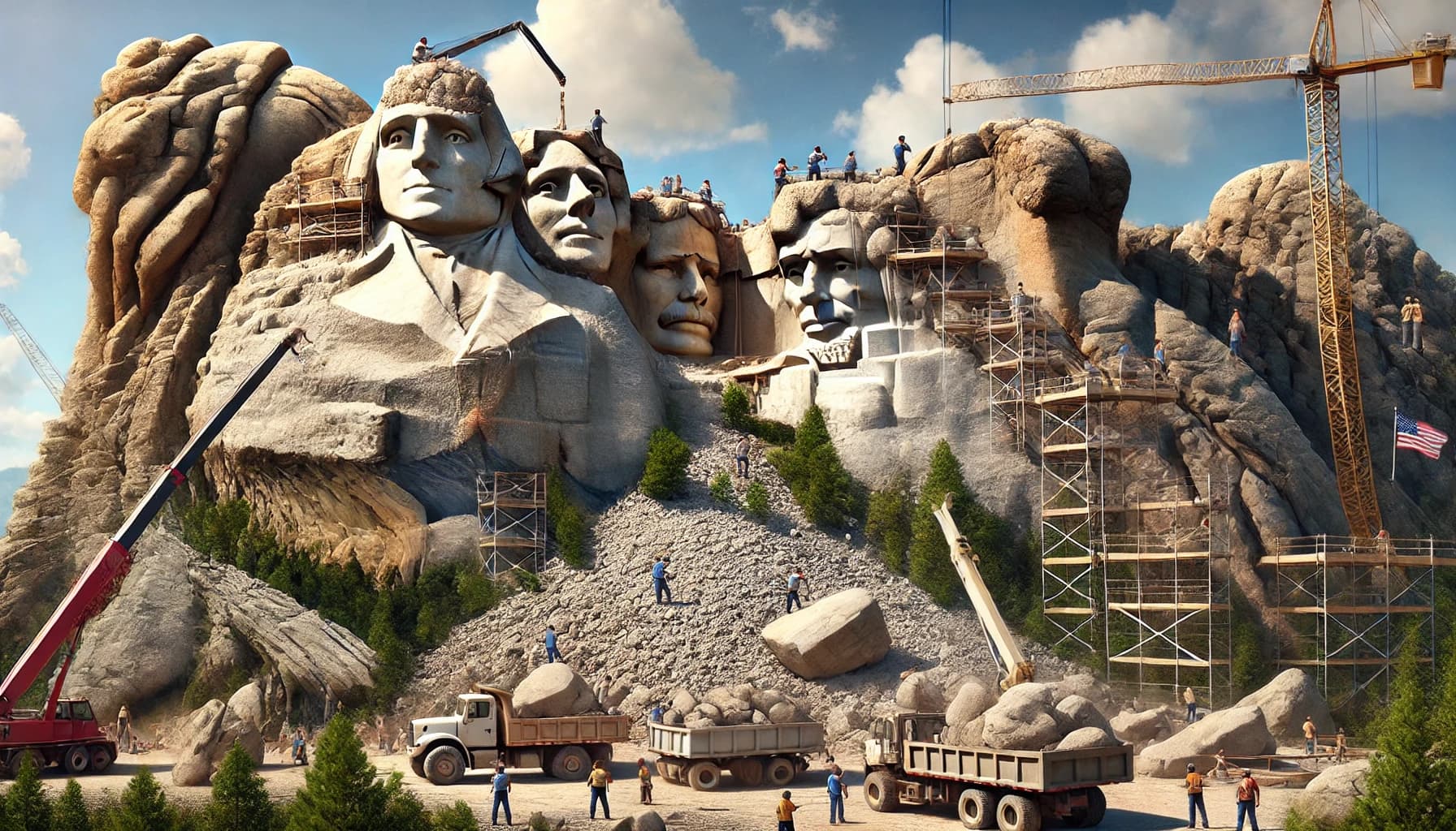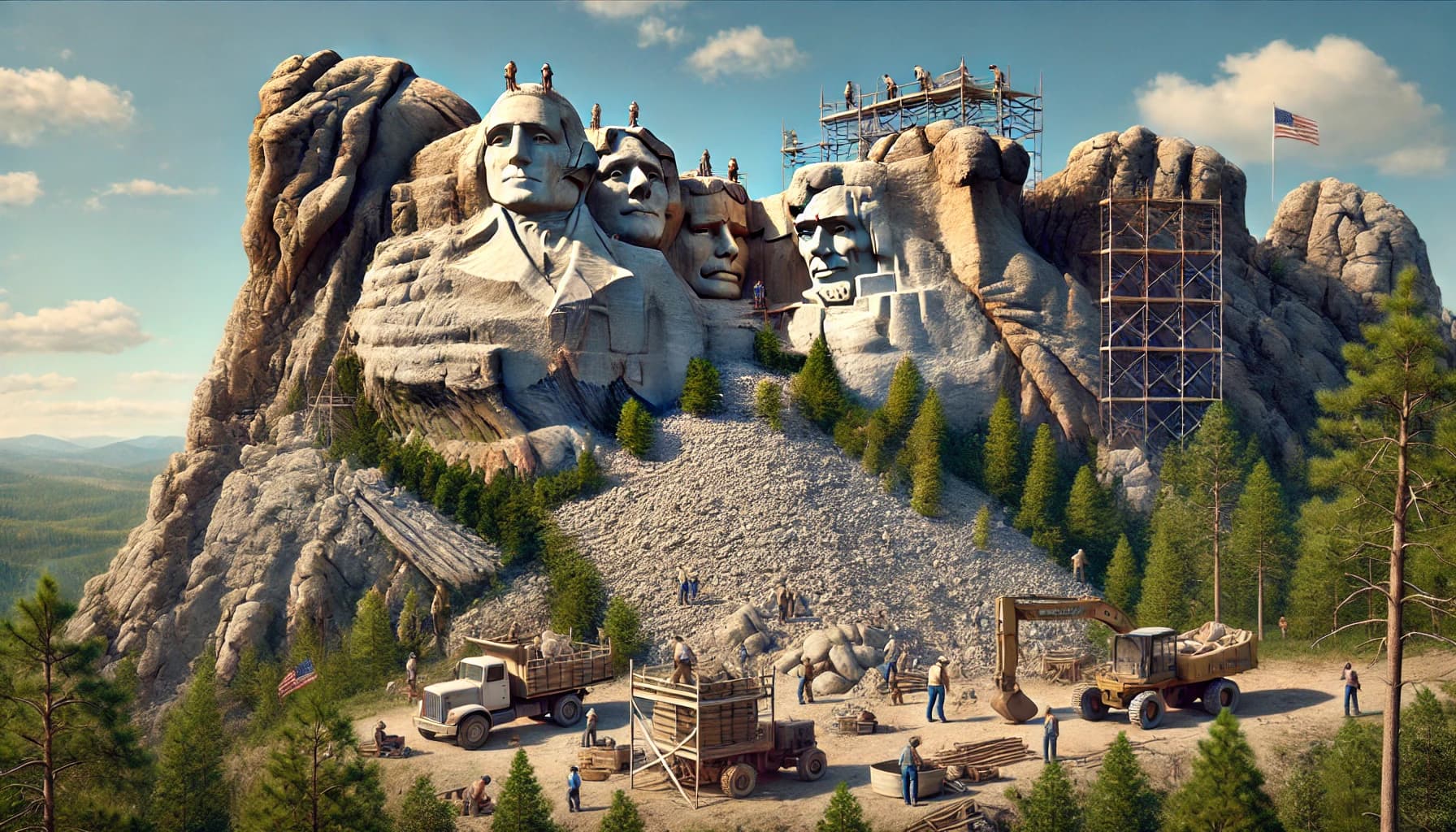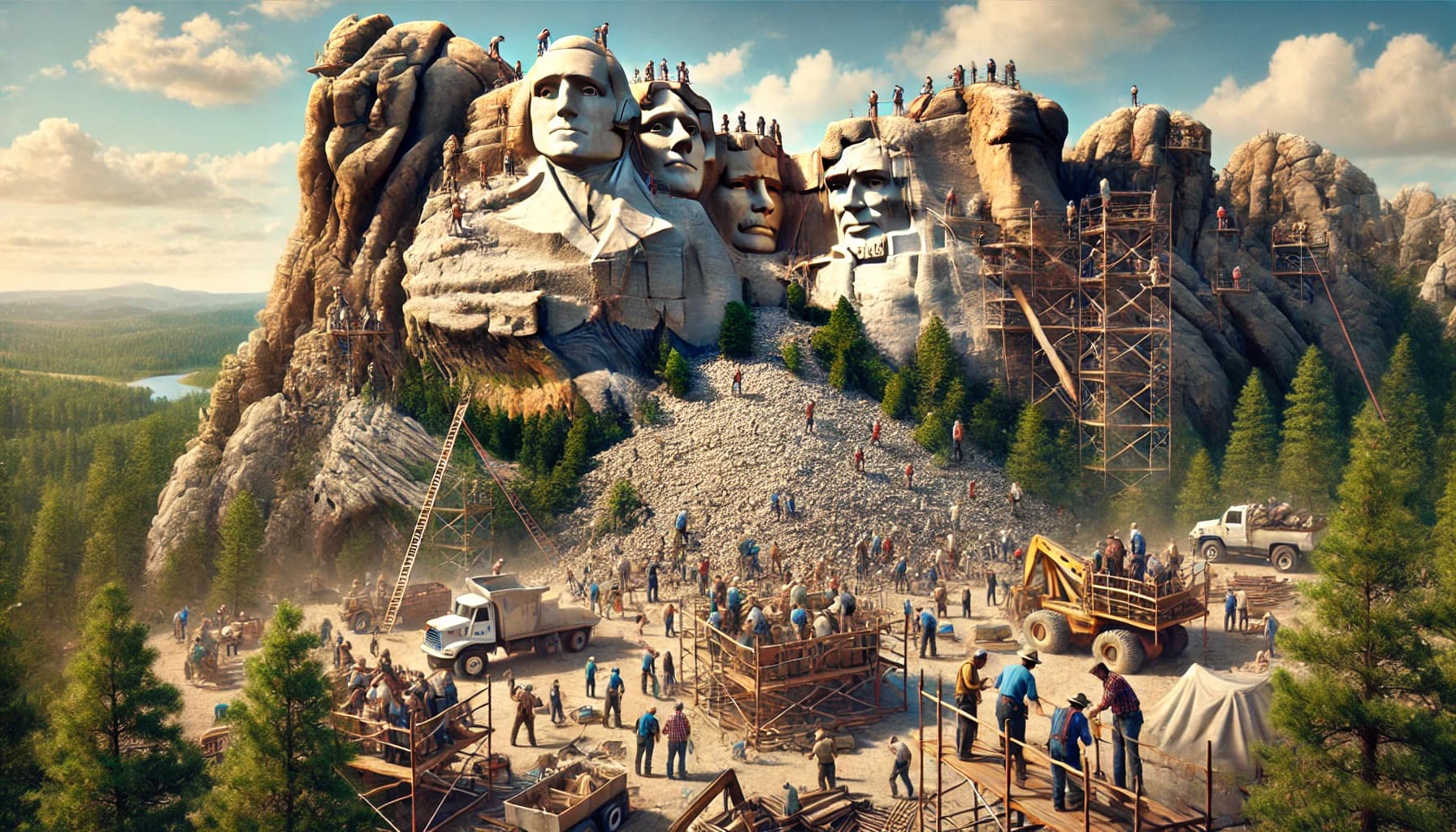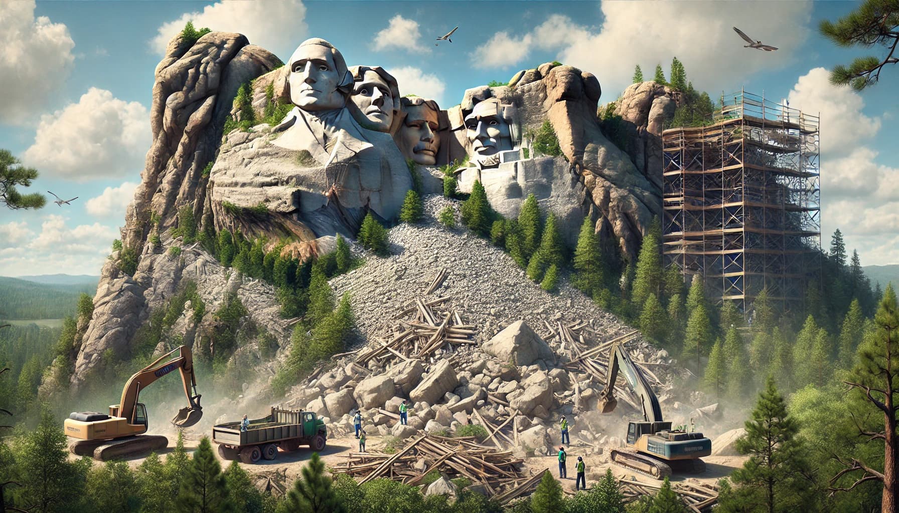 "description": "Thousands of volunteers swarm across Mount Rushmore, working tirelessly to restore the mountain to its original natural form. Scaffolding clings to the rock face as teams of workers carefully chip away at the carved presidents, while others use ropes.",